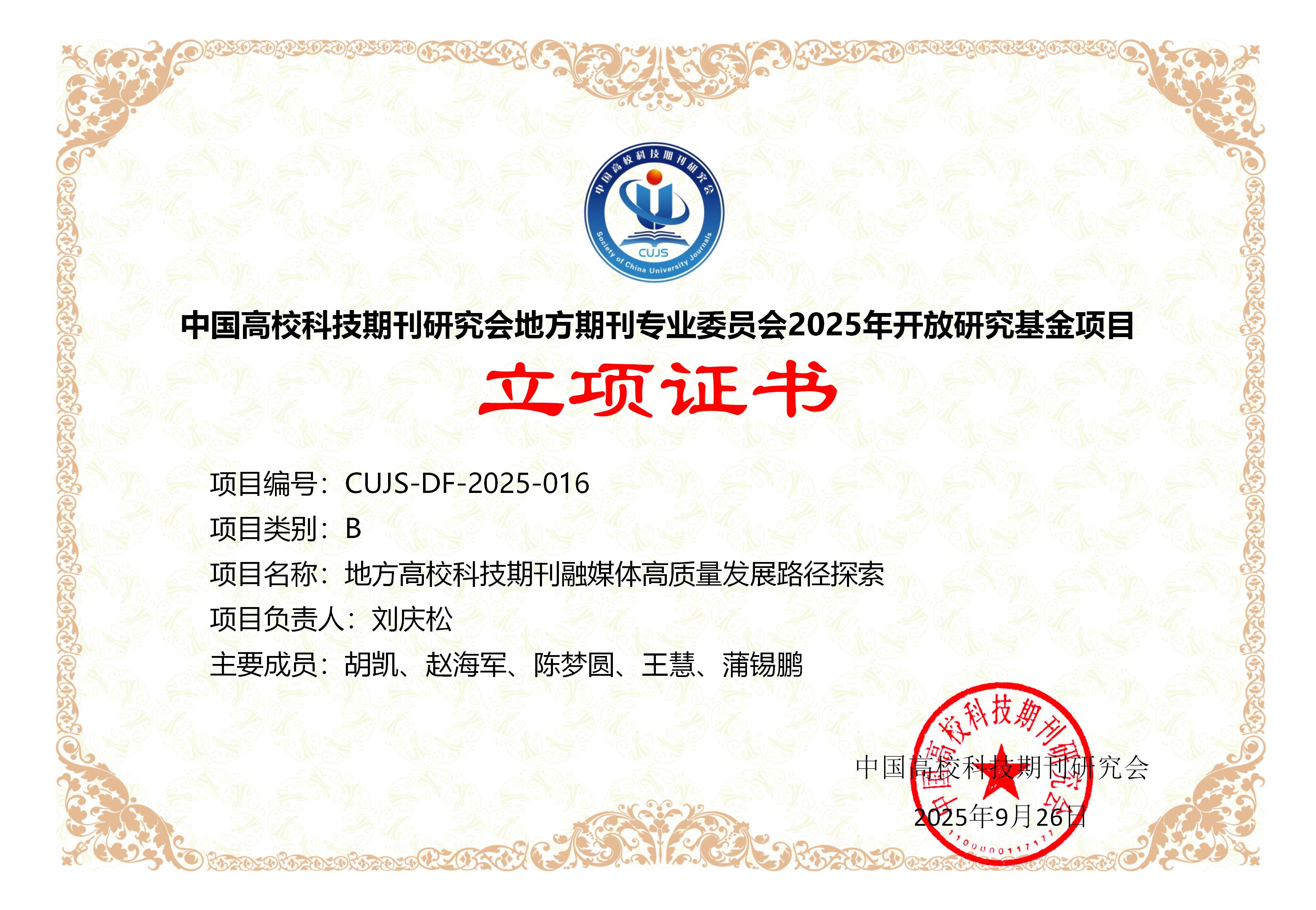 近日,中国高校科技期刊研究会地方期刊专业委员会设立的2025年开放研究基金项目结果揭晓,学报编辑部刘庆松等申报的“地方高校科技期刊融媒体高质量发展路径探索”课题,成功获批B类项目。