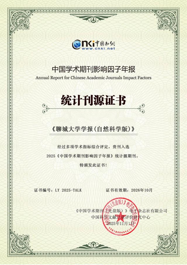 另外消息,11月1日,中国知网发布了中国学术期刊影响因子年报,《聊城大学学报(自然科学版)》影响力指数(CI)学科排名居全国296种同类期刊(自然科学与工程技术综合类)第74位,复合影响因子(JIF)为1.046,学科排名第87位,影响力排名再次提升。