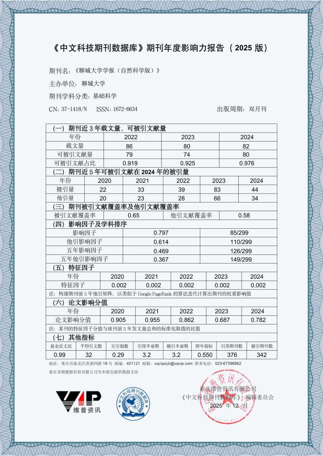 近日,维普网2025年度《期刊影响力报告》发布,《聊城大学学报(自然科学版)》在该数据库中的影响因子为0.797,在299种同类期刊学科排名第85位,在 2025 年度维普资讯期刊评选中荣获“学术影响力进步期刊”称号。